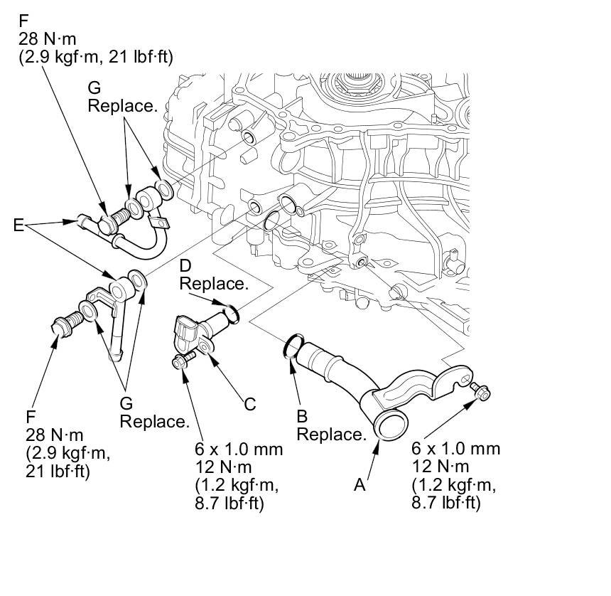 79. Install the two CVTF cooler lines (E) with the line bolts (F) and new sealing washers (G).