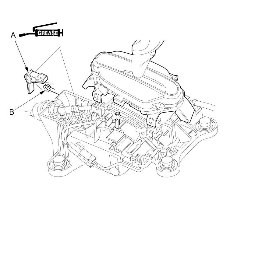 3. Remove the shift lock release (A) and release spring (B), and replace the shift lock release or the release spring.