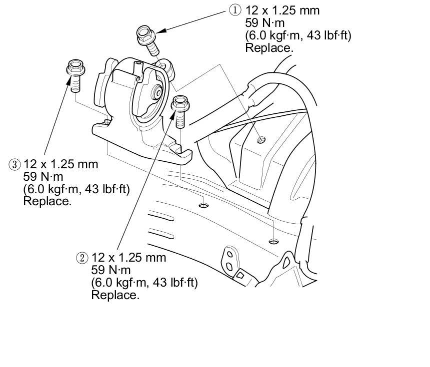 13. Install the transmission mount, and loosely install the new transmission mount mounting bolts, then tighten the transmission mount mounting bolts in the numbered sequence shown.