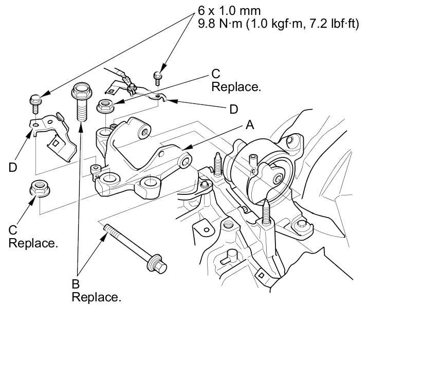 11. Remove the transmission mount bolts (B) and nuts (C), then remove the transmission mount bracket (D).