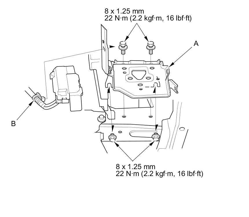 23. Install the battery base (A), then install the harness clamp (B).
