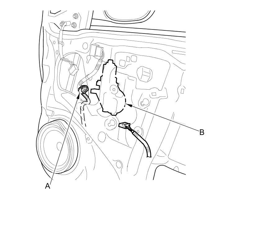 4. Disconnect the 2P connector (A) from the front passenger's power window motor (B).