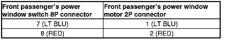 2. Test the motor in each direction by connecting battery power and ground to the front passenger's power window switch 8P connector according to the table.