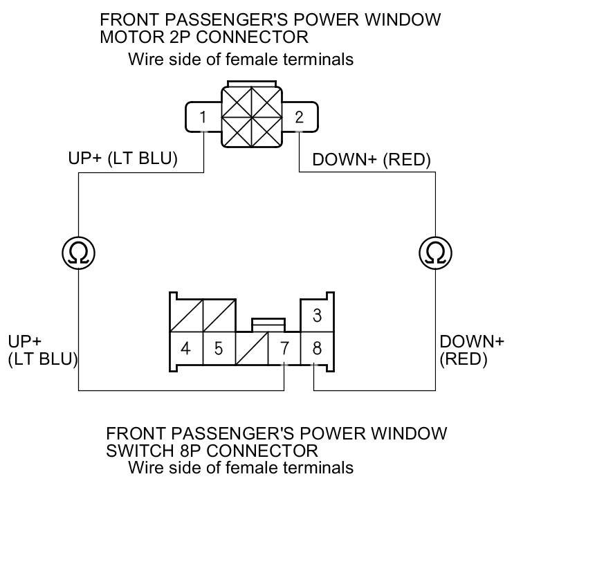 5. Check for continuity between the front passenger's power window switch 8P connector terminals and the front passenger's power window motor 2P connector terminals as shown. There should be continuity.