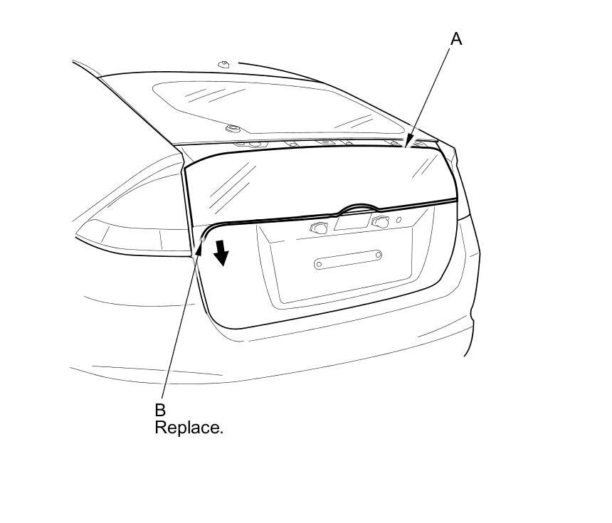 2. Remove the rubber dam B from the edge of the lower rear window (A). If necessary, cut off the rubber dam with a utility knife.