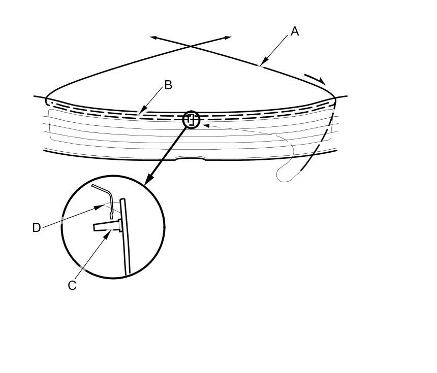 15. Remove the adhesive backing, and attach the rubber dam A, the fastener (B) and the clips (C) to the inside face of the window (D) as shown: