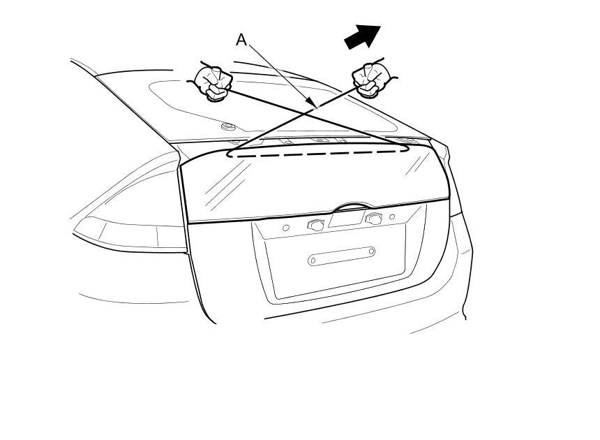 8. Hold a piece of wood, and with a helper on the other side, pull back the piano wire (A) to carefully cut through the entire lower rear window adhesive.