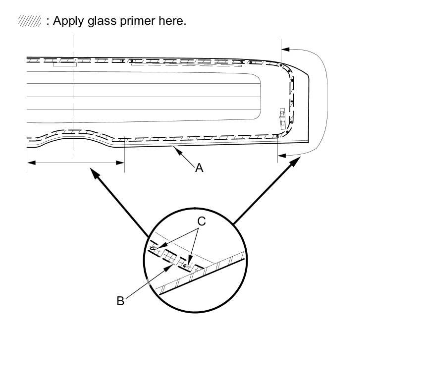 - Apply glass primer to the bottom (B) of the lower rear window using the printed dots (C) on the lower rear window as a guide.