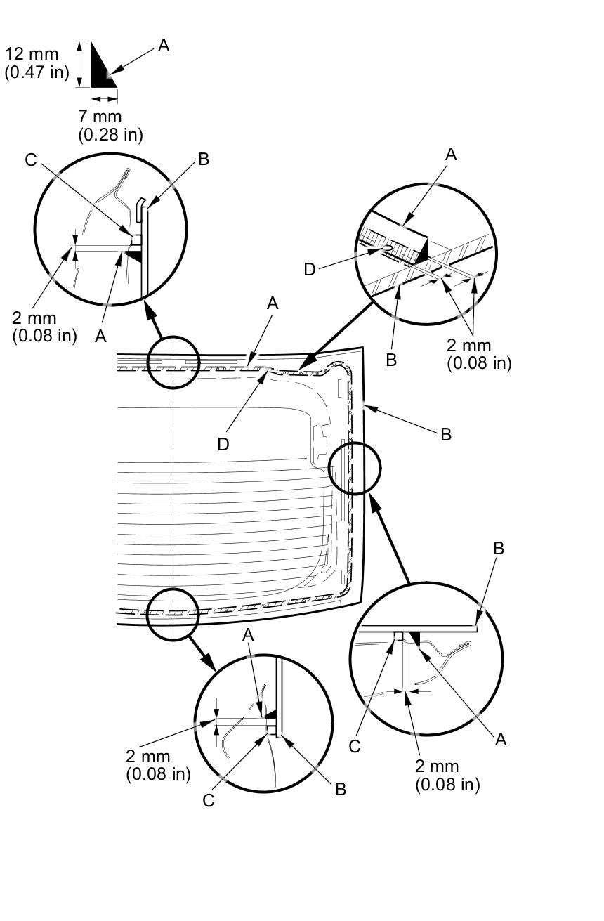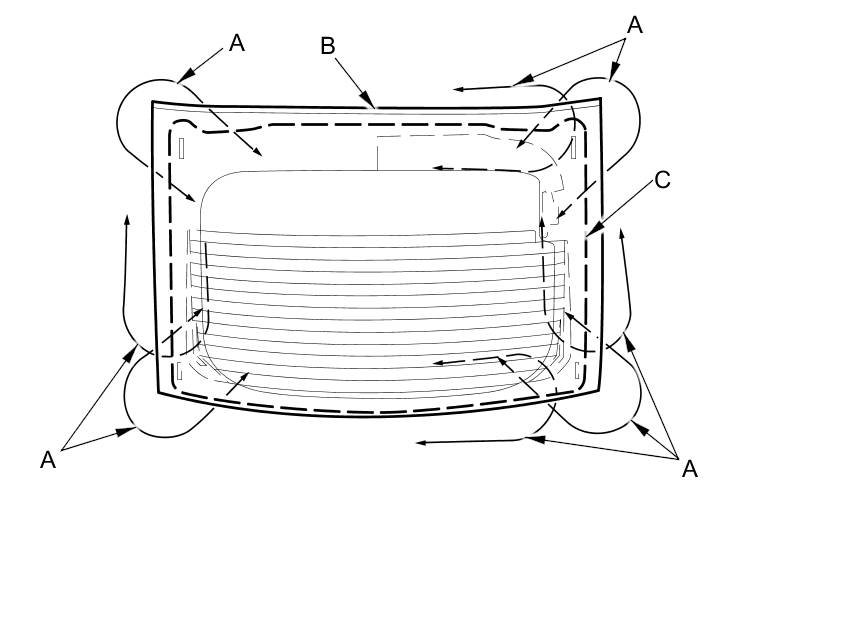 21. Pack adhesive into the cartridge without air pockets to ensure continuous delivery. Put the cartridge in a caulking gun, and run a continuous bead of adhesive (A) to the upper rear window (B) along the edge of the rubber dams (C) as shown: