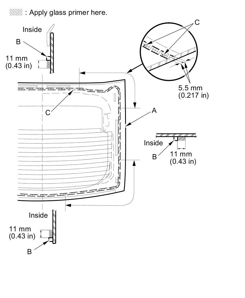 - Apply the glass primer to both corner areas of the upper rear window using the printed dots (C) on the upper rear window as a guide.