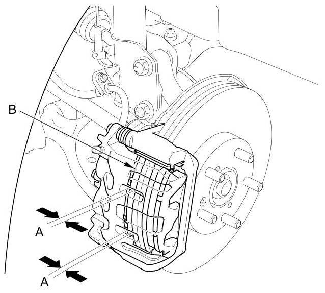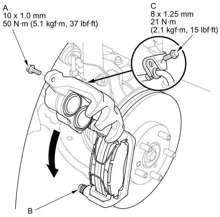 Verify that the caliper pins (C) move in and out smoothly. Clean and lube if needed.