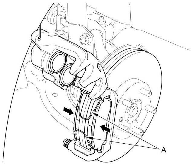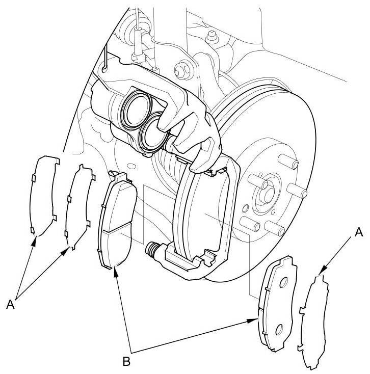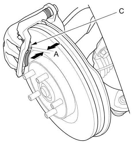 3. Check the thickness (A) of the inner pad (B) and the outer pad (C). Do not include the thickness of the backing plate.