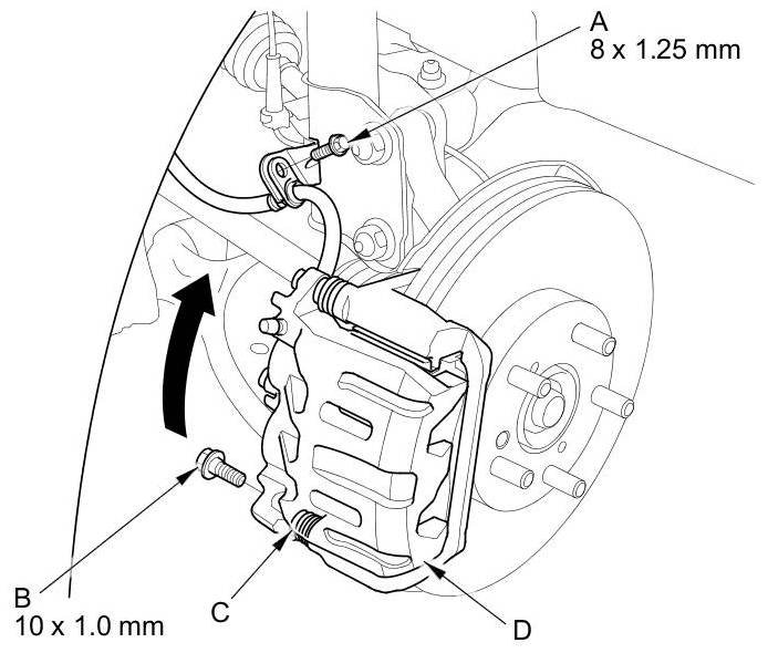5. Remove the flange bolt (B) while holding the caliper pin (C) with a wrench. Be careful not to damage the pin boot, and pivot the caliper body (D) up out of the way. Check the hose and the pin boots for damage and deterioration.