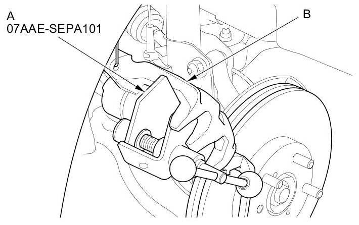 13. Install the brake caliper piston compressor tool (A) on the caliper body (B).