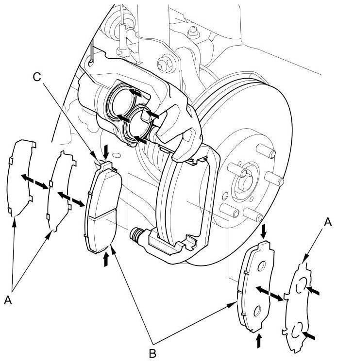 17. Install the brake pads and pad shims correctly. Install the brake pad with the wear indicator (C) on the upper inside position. If you are reusing the brake pads, always reinstall the brake pads in their original positions to prevent a temporary loss of braking efficiency.