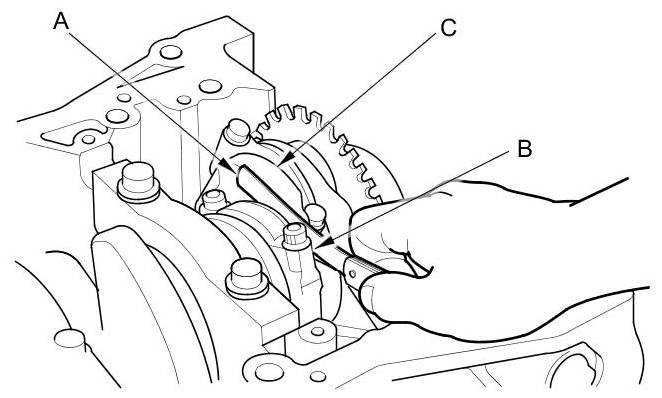 3. Measure the connecting rod end play with a feeler gauge (A) between the connecting rod (B) and the crankshaft (C).