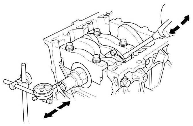 5. Push the crankshaft firmly away from the dial indicator by prying, and zero the dial against the end of the crankshaft. Then pull the crankshaft firmly back toward the indicator by prying; the dial reading should not exceed the service limit.