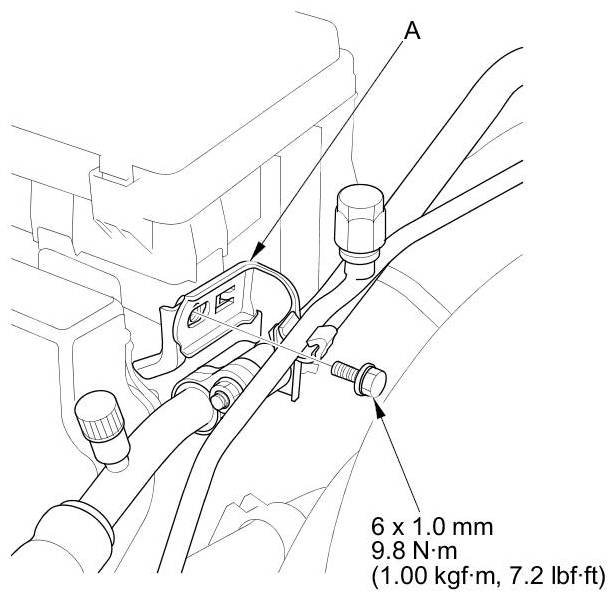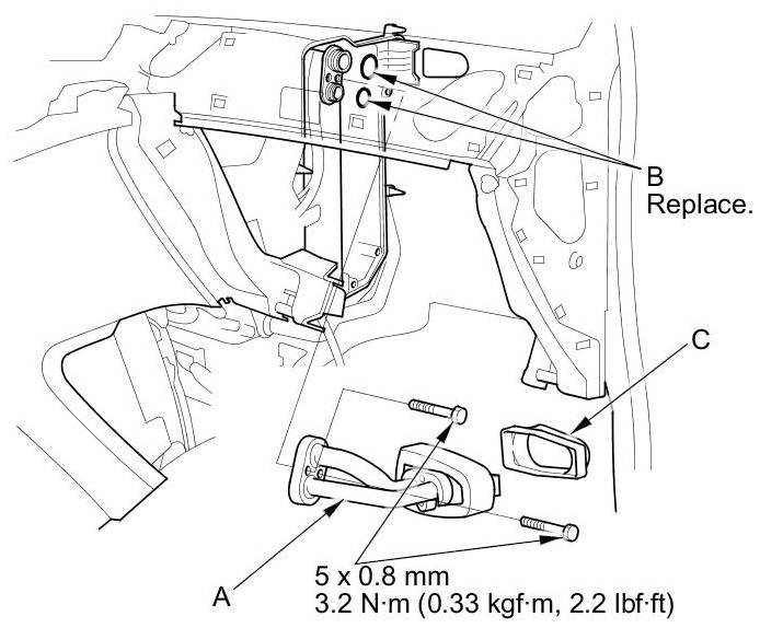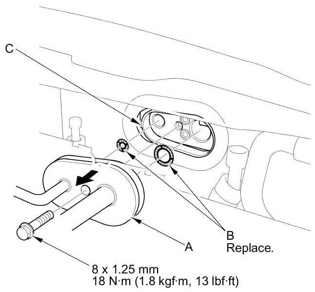 3. Remove the bolt, then disconnect the A/C lines (A) from the front evaporator core, and remove the O-rings (B). Separate the guide (C) from the front expansion valve.