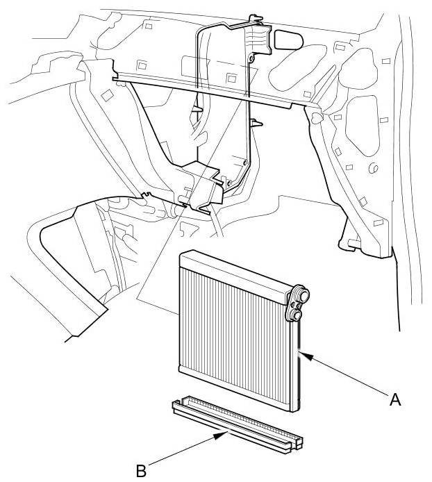 9. Carefully pull out the front evaporator core (A), then remove the plate (B).