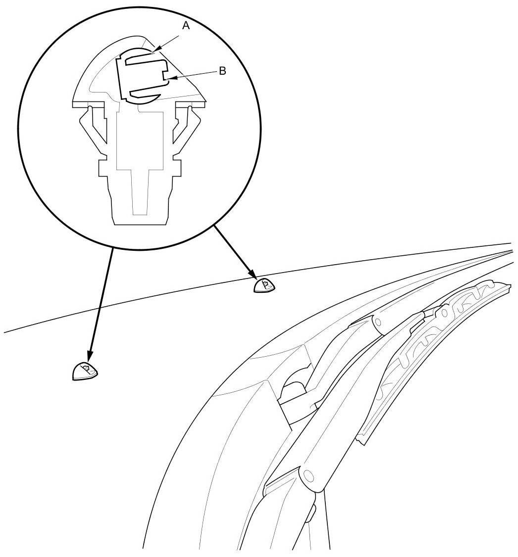 - Do not insert tools into the nozzle hole (B) as it may cause the washer fluid to spray incorrectly.