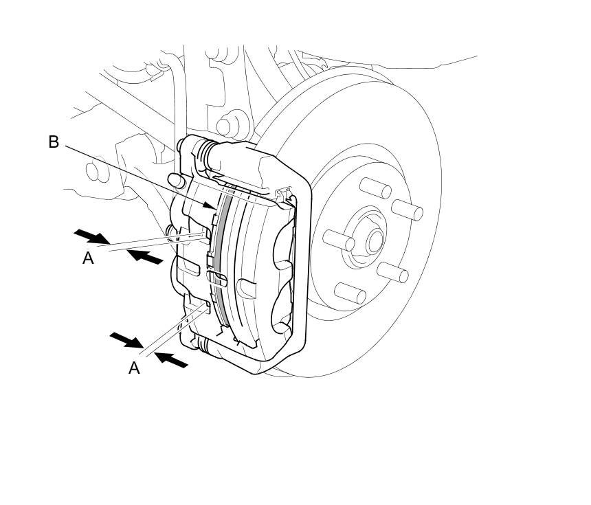 8. Clean the caliper bracket (B) thoroughly; remove any rust, and check for grooves and cracks.