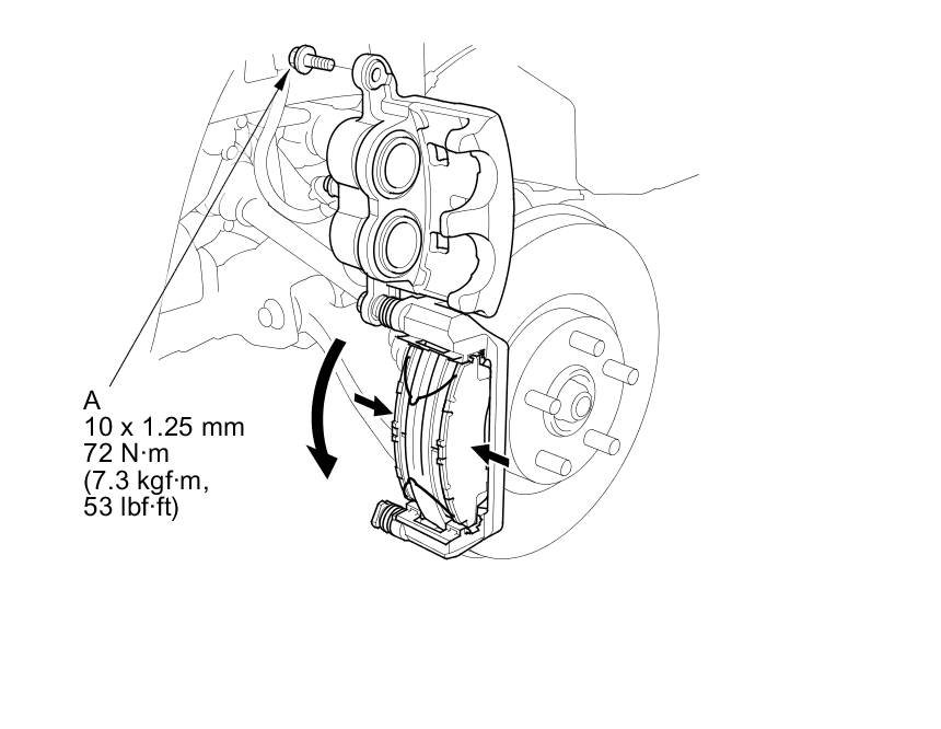 18. Pivot the caliper down into position. while holding the brake pads. Install the flange bolt (A), and tighten it to the specified torque.