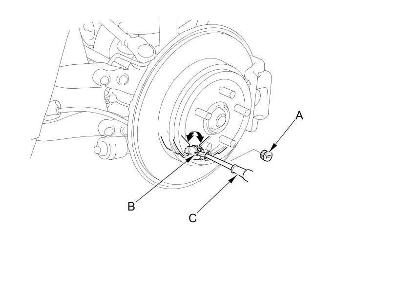 6. Turn the ratchet teeth on the adjuster nut (B) with a brake adjuster tool or a flat-tip screwdriver (C) until the shoes lock against the parking brake drum. Then back off the adjuster 10 clicks, and install the access plug.