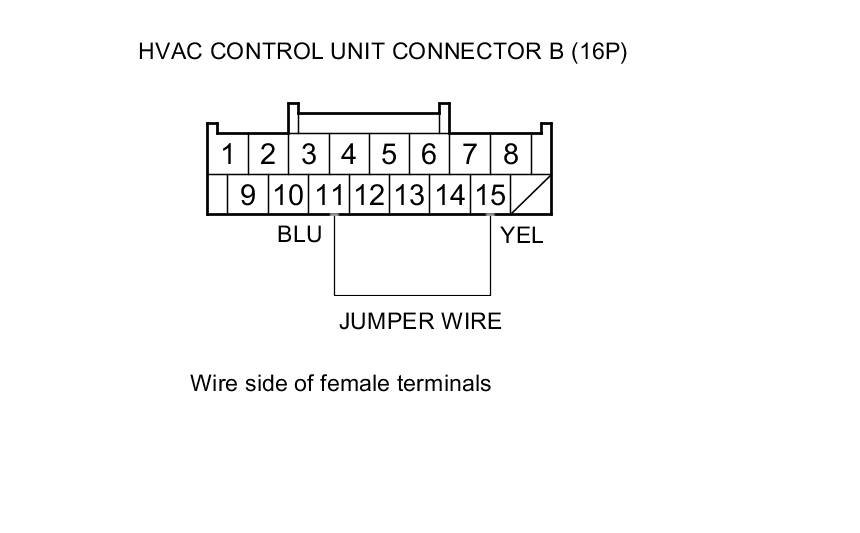 7. Connect HVAC control unit connector B (16P) terminals No. 11 and No. 15 with a jumper wire.