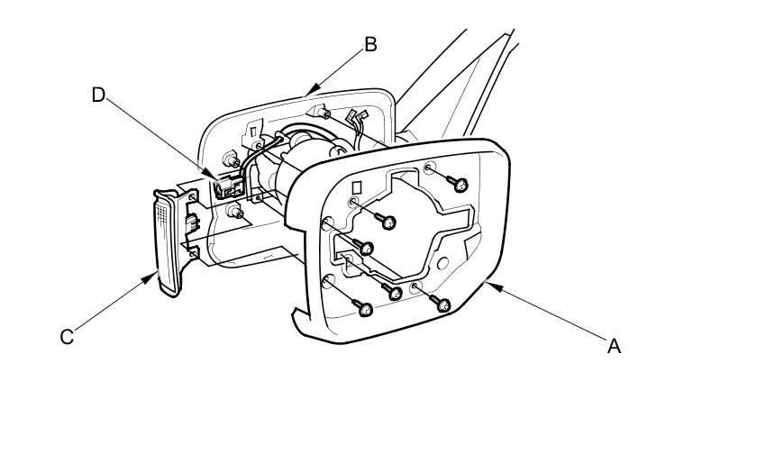 3. Pull out the side turn signal light (C) slightly from the mirror (B).