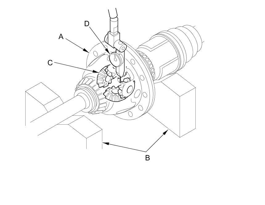 3. Measure the backlash of the pinion gears (C) using a dial indicator (D).