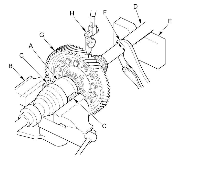 4. Measure the backlash of the final driven gear (G) using a dial indicator (H).