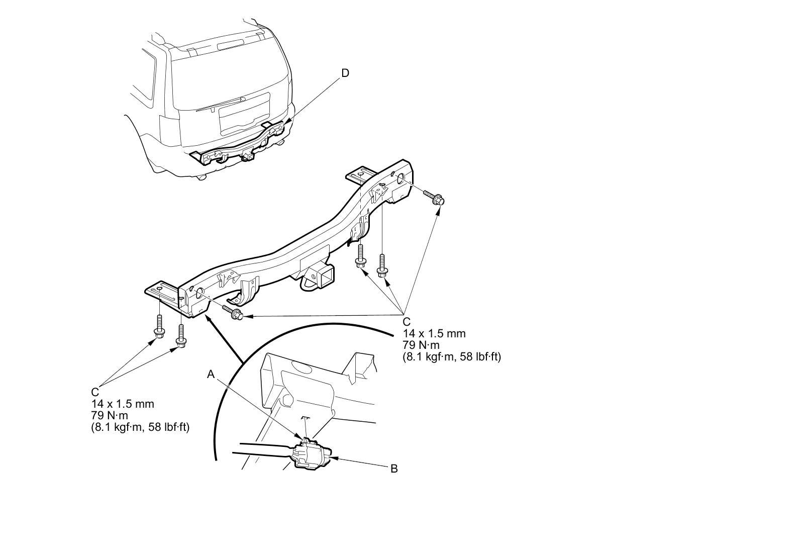 3. Remove the bolts (C), then remove the trailer hitch (D).