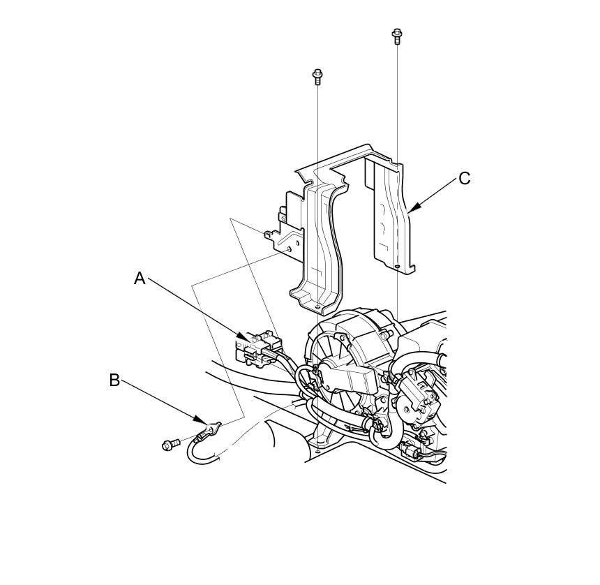 5. Remove the bolt and ground terminal (B), then remove the bolts and the bracket (C).