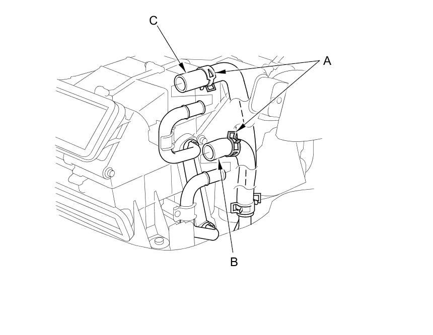 6. Slide the hose clamps (A) back, then disconnect the rear inlet heater hose (B) and the rear outlet heater hose (C) from the rear heater core. Note the layout of the hose.