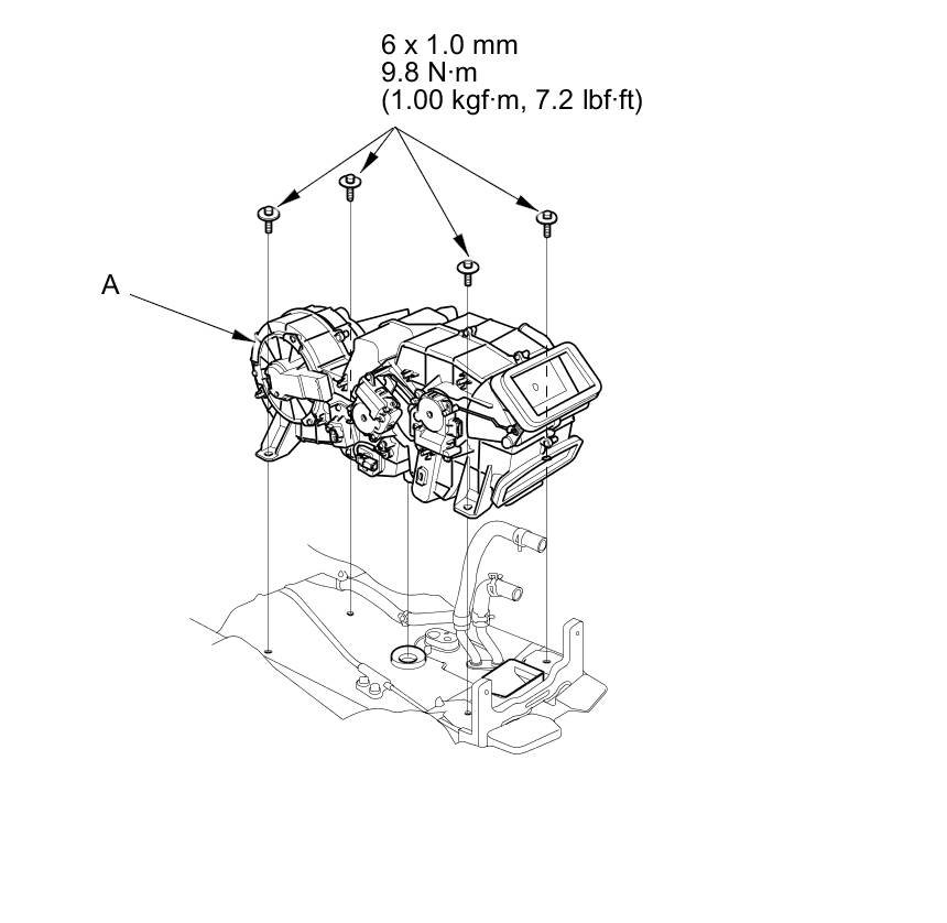 10. Remove the mounting bolts and rear HVAC unit (A). Plug or cap the lines immediately after disconnecting them to avoid moisture and dust contamination.