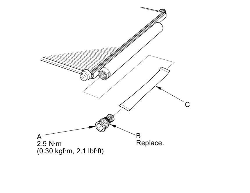 2. Remove the cap (A) from the bottom of the A/C condenser. Remove the O-ring (B) and the desiccant (C).