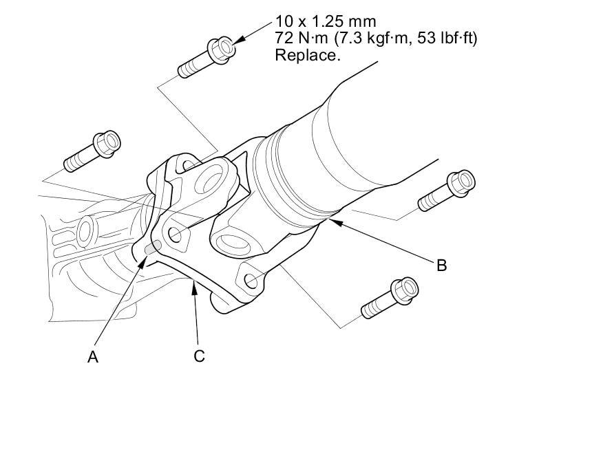 3. Make a reference mark (A) across the propeller shaft (B) and the transfer companion flange (C).