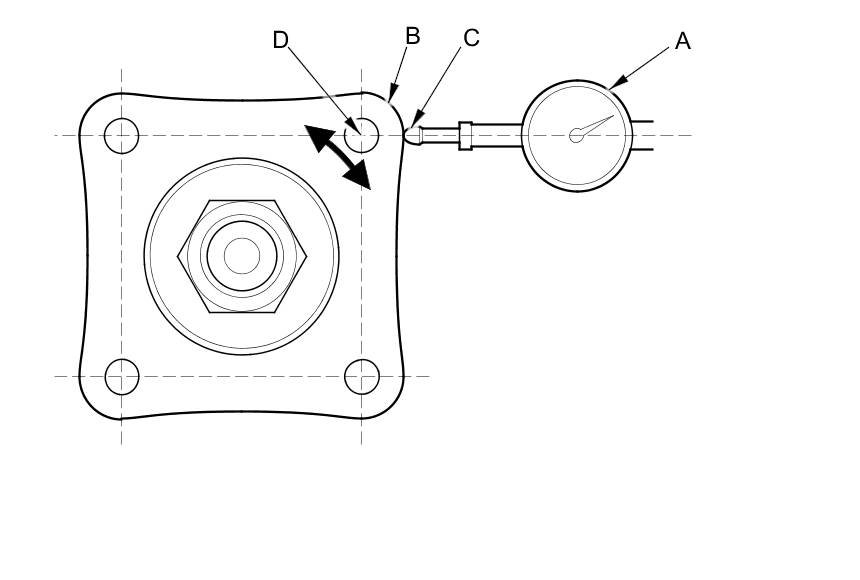 5. Set a dial indicator (A) on the transfer companion flange (B); position the dial indicator tip (C) on the direct extension of the bolt hole center (D).