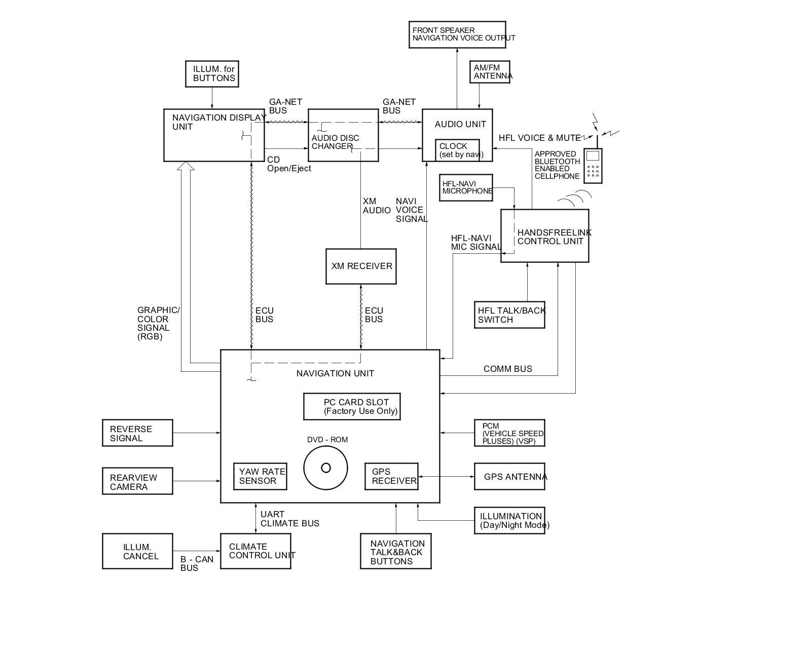 The navigation system is composed of the navigation unit, the PCM (vehicle speed pulse), HandsFreeLink control unit (to send a POI phone number or place a call) the GPS antenna, microphone, voice control switch, audio unit, audio disc changer, XM receiver, climate control unit, and the navigation display.