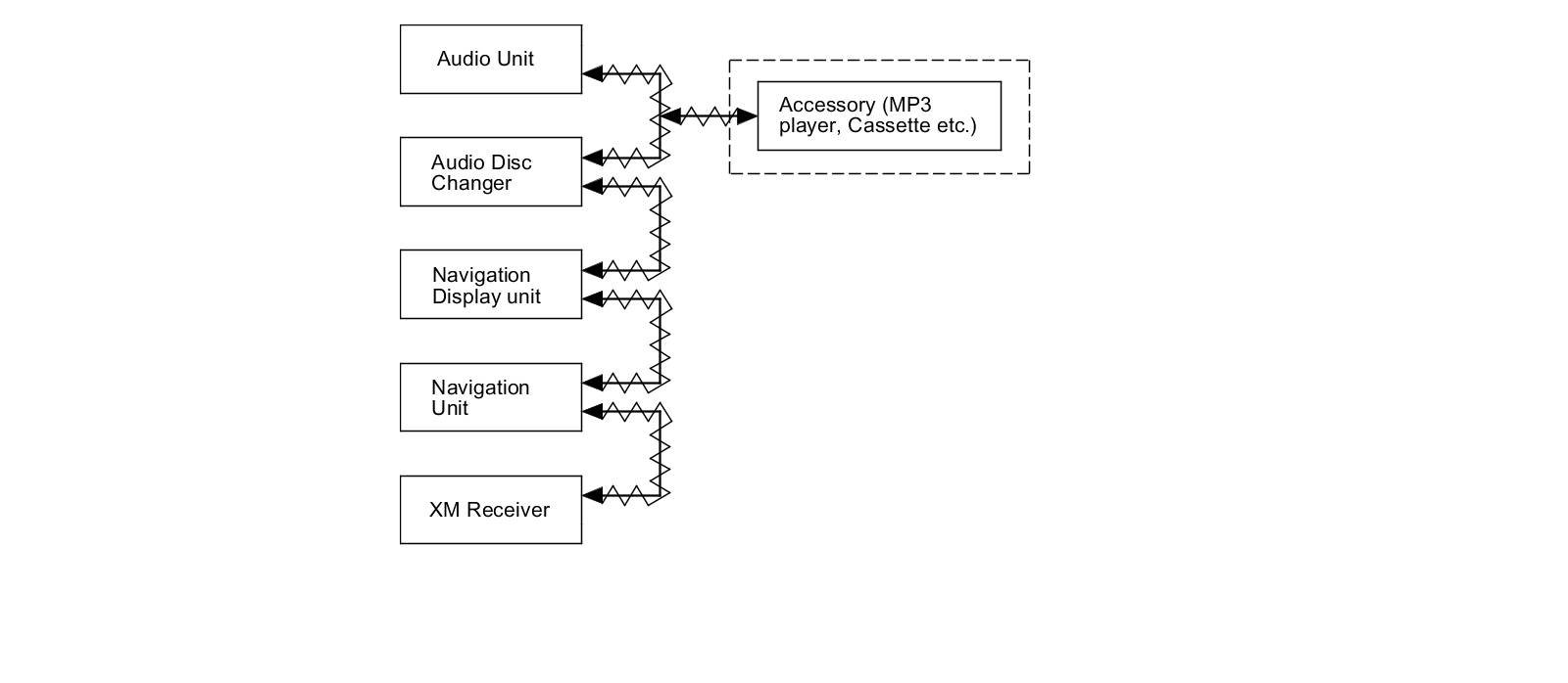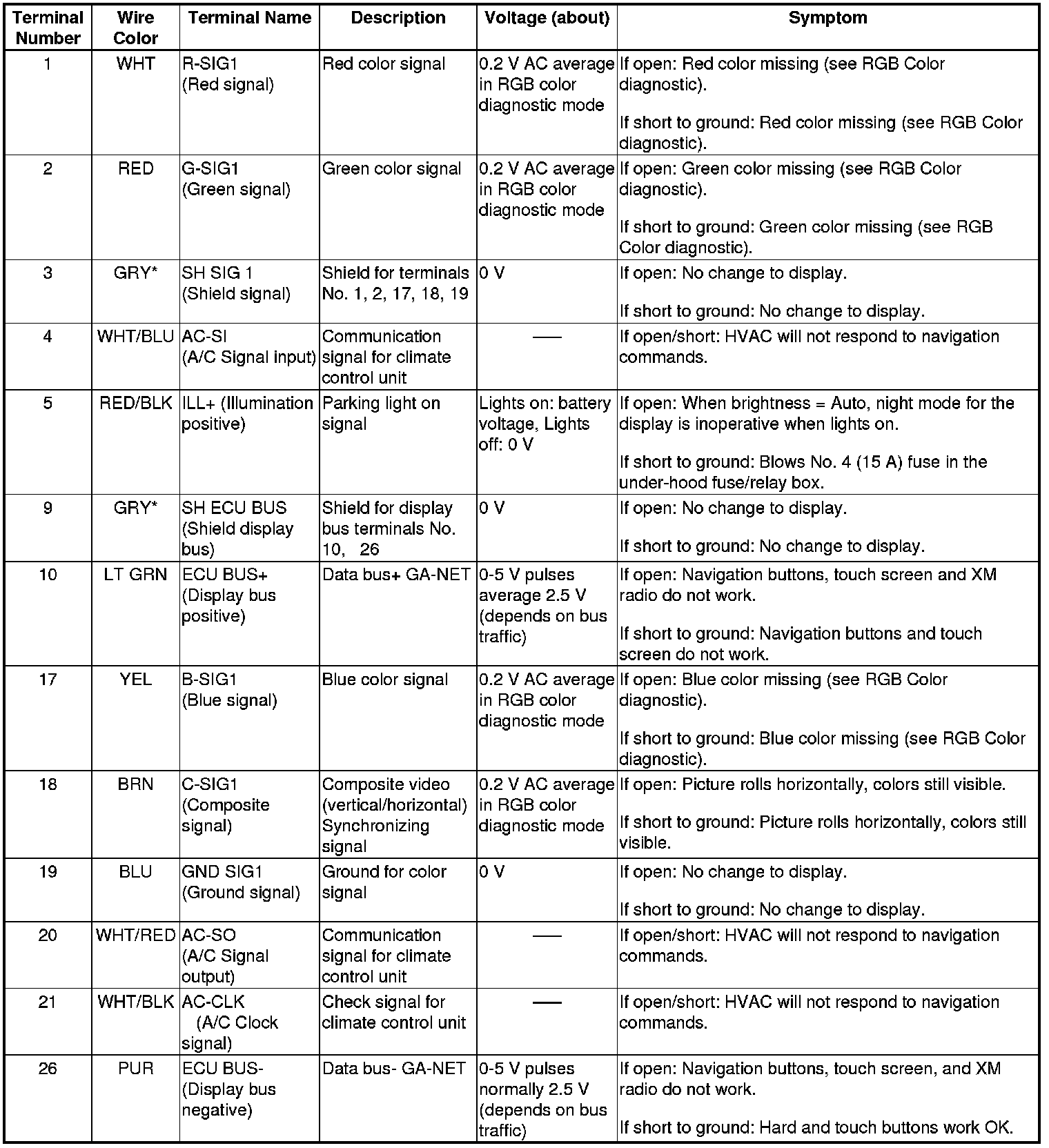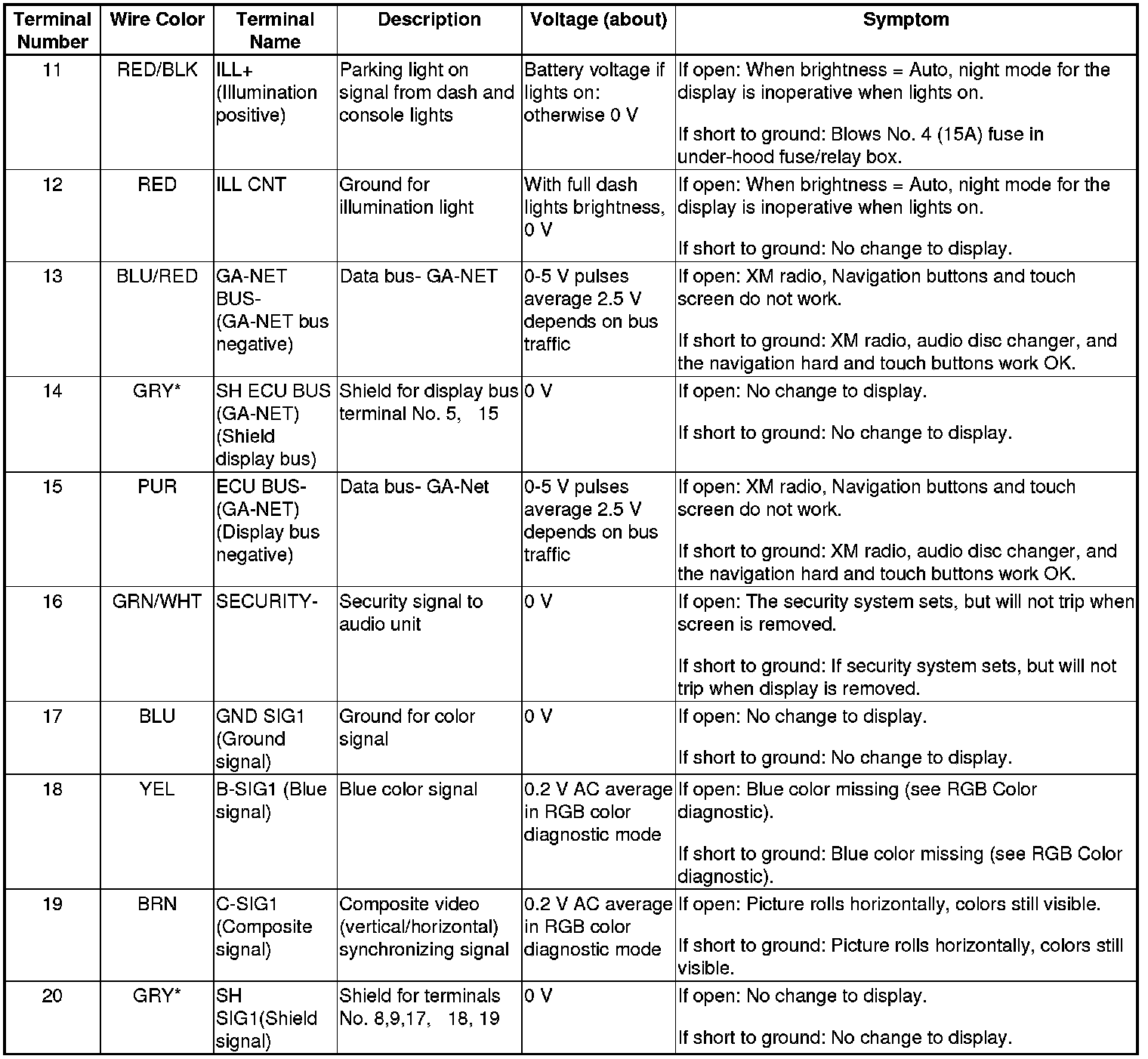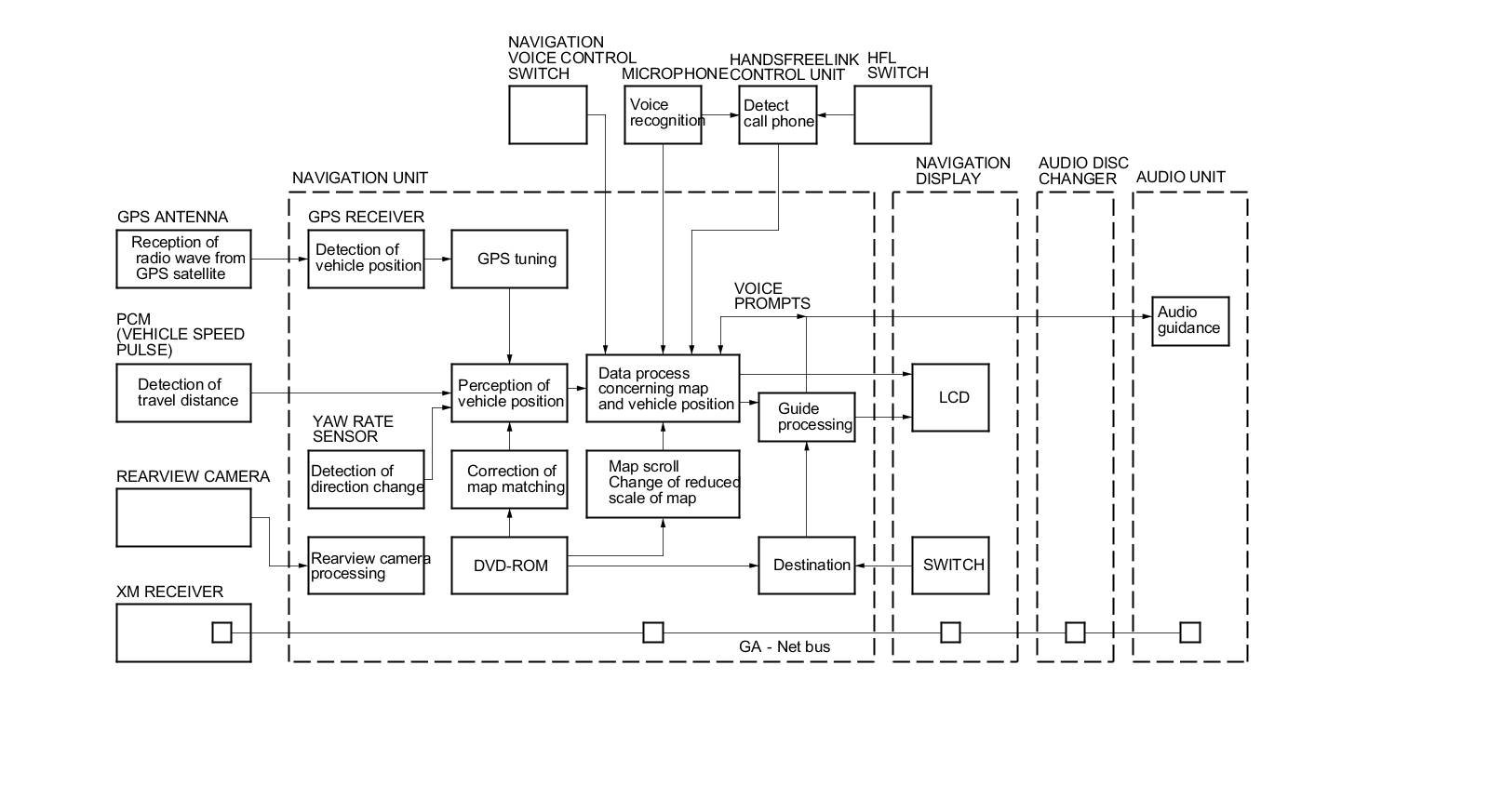 The GA-NET II communication bus passes information back and forth between the navigation display unit, the navigation unit and the audio system. The information passed on this bus is audio settings directed by the navigation unit.