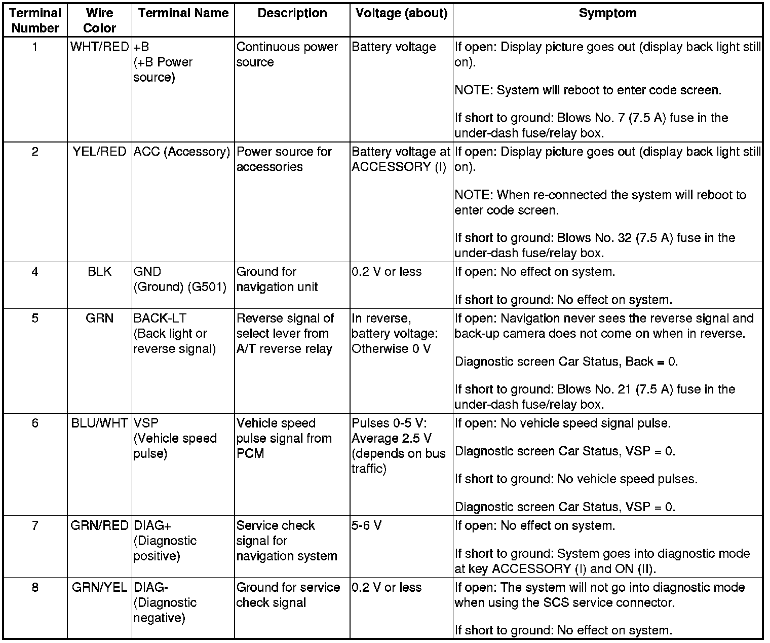 The illumination signal (headlights ON) is used by the navigation unit to automatically switch the display between Night and Day brightness modes. When the gauge control module brightness control is set to max brightness, the navigation system stays in the day mode, even with the headlights on.