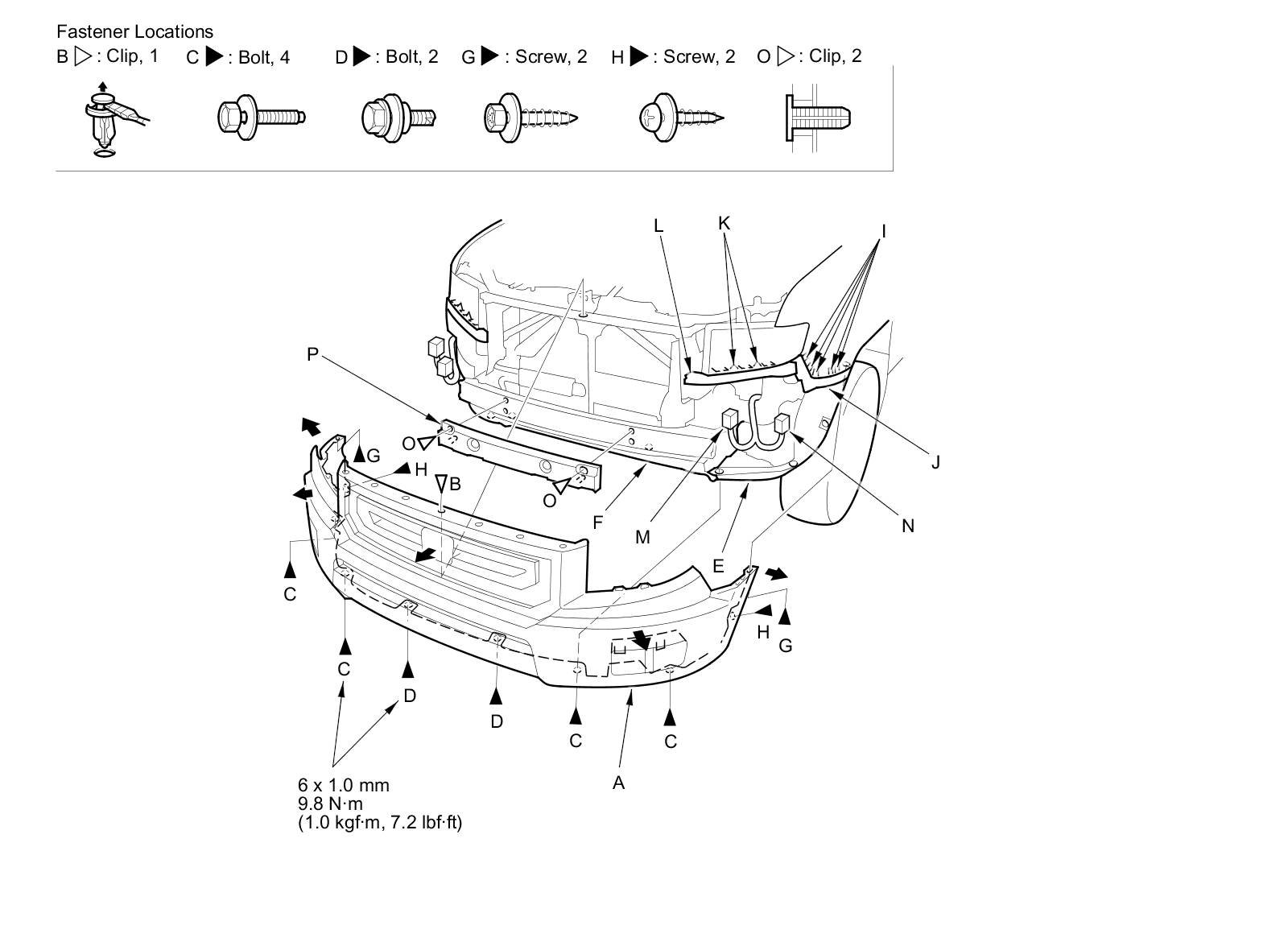 6. Remove the clips (O), then remove the front bumper absorber (P).