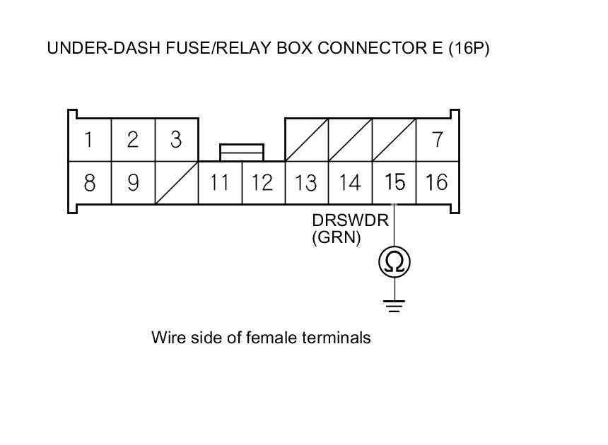 8. Check for continuity between under-dash fuse/relay box connector E (16P) terminal No. 15 and body ground.