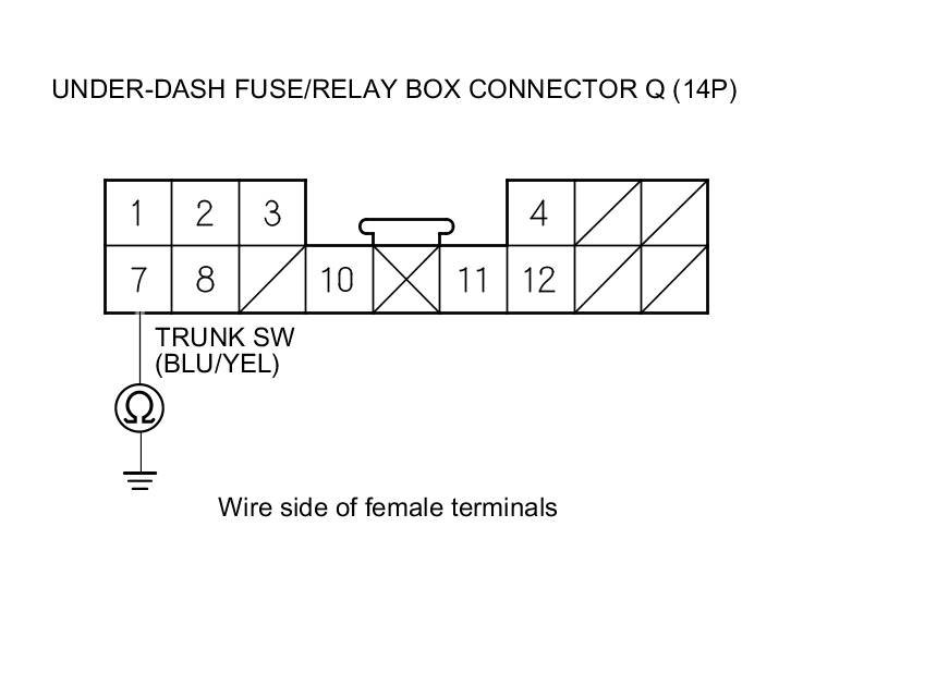 7. Check for continuity between under-dash fuse/relay box connector Q (14P) terminal No. 7 and body ground.