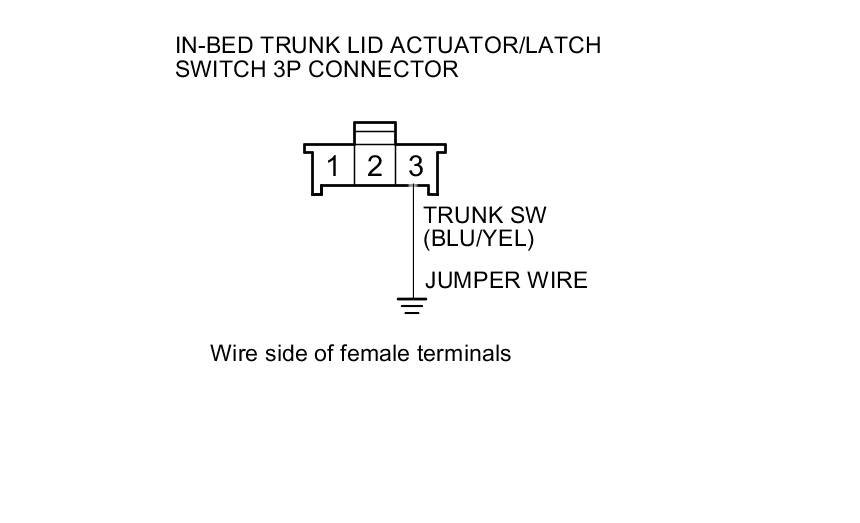 9. Connect in-bed trunk lid actuator/latch switch 3P connector terminal No. 3 and body ground with a jumper wire.