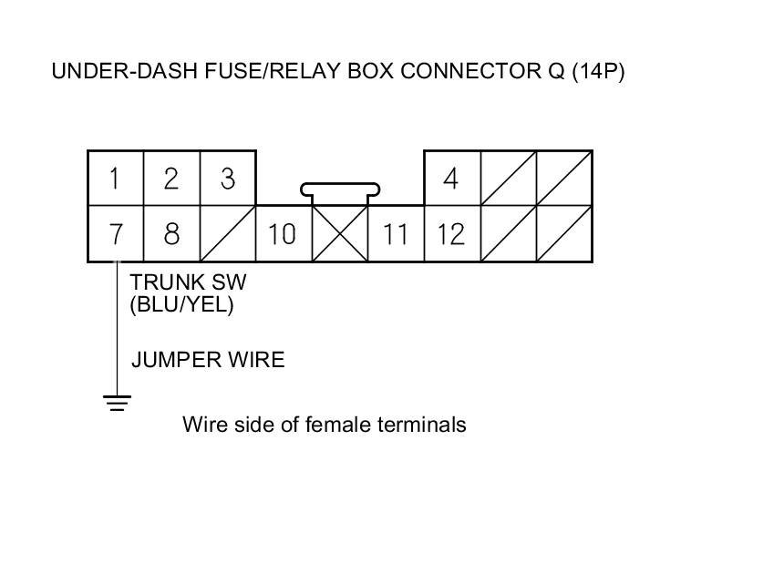 12. Connect under-dash fuse/relay box connector Q (14P) terminal No. 7 and body ground with a jumper wire.