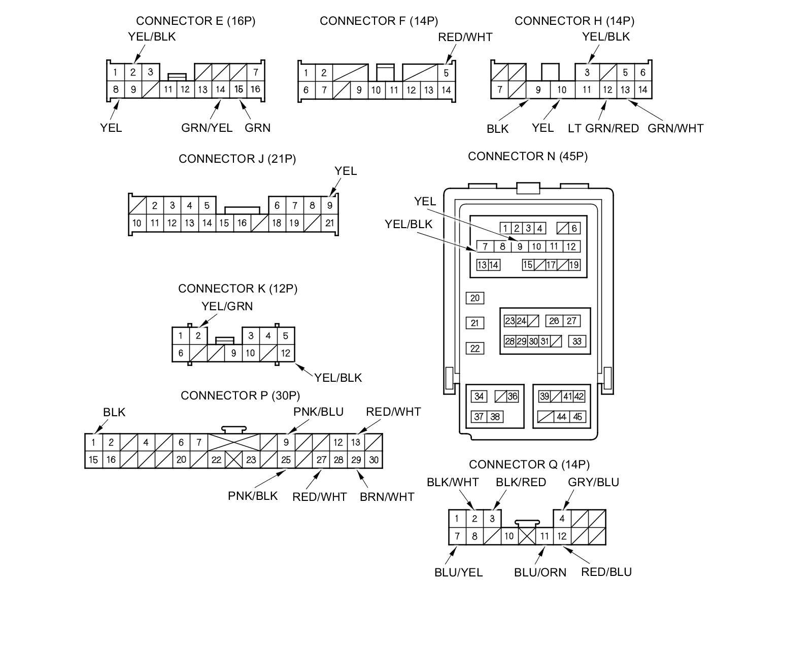 3. Disconnect the under-dash fuse/relay box connectors E, F, H, J, K, N, P and Q.