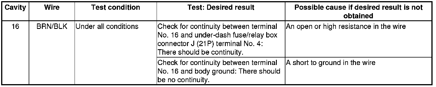 6. Reconnect all connectors to the under-dash fuse/relay box. Turn the ignition switch to ON (II), and do the following input tests:
