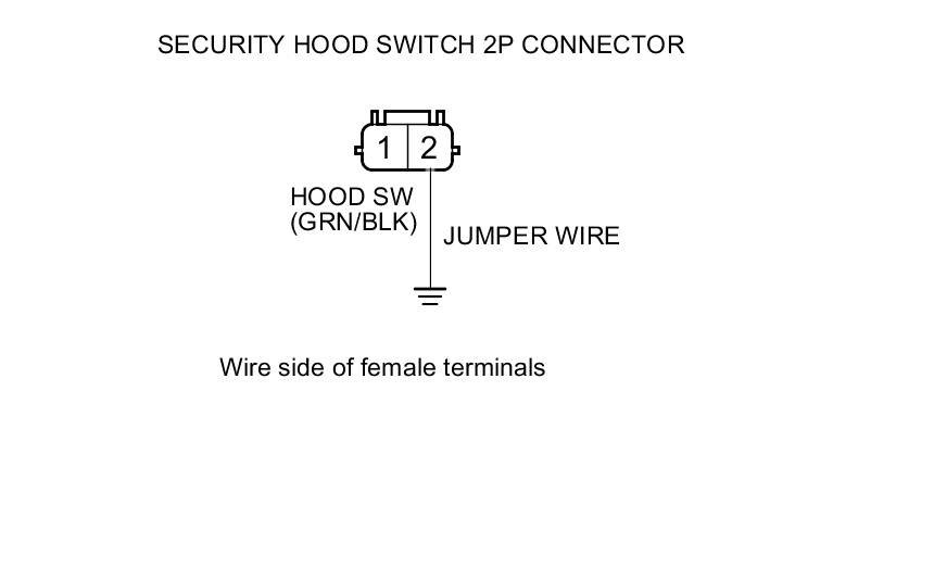 9. Connect security hood switch 2P connector terminal No. 2 and body ground with a jumper wire.