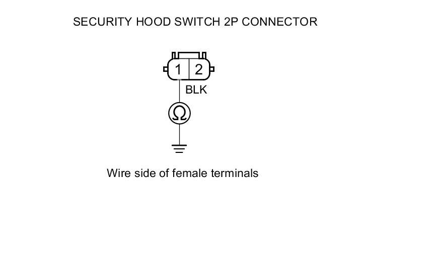 11. Check for continuity between security hood switch 2P connector terminal No. 1 and body ground.